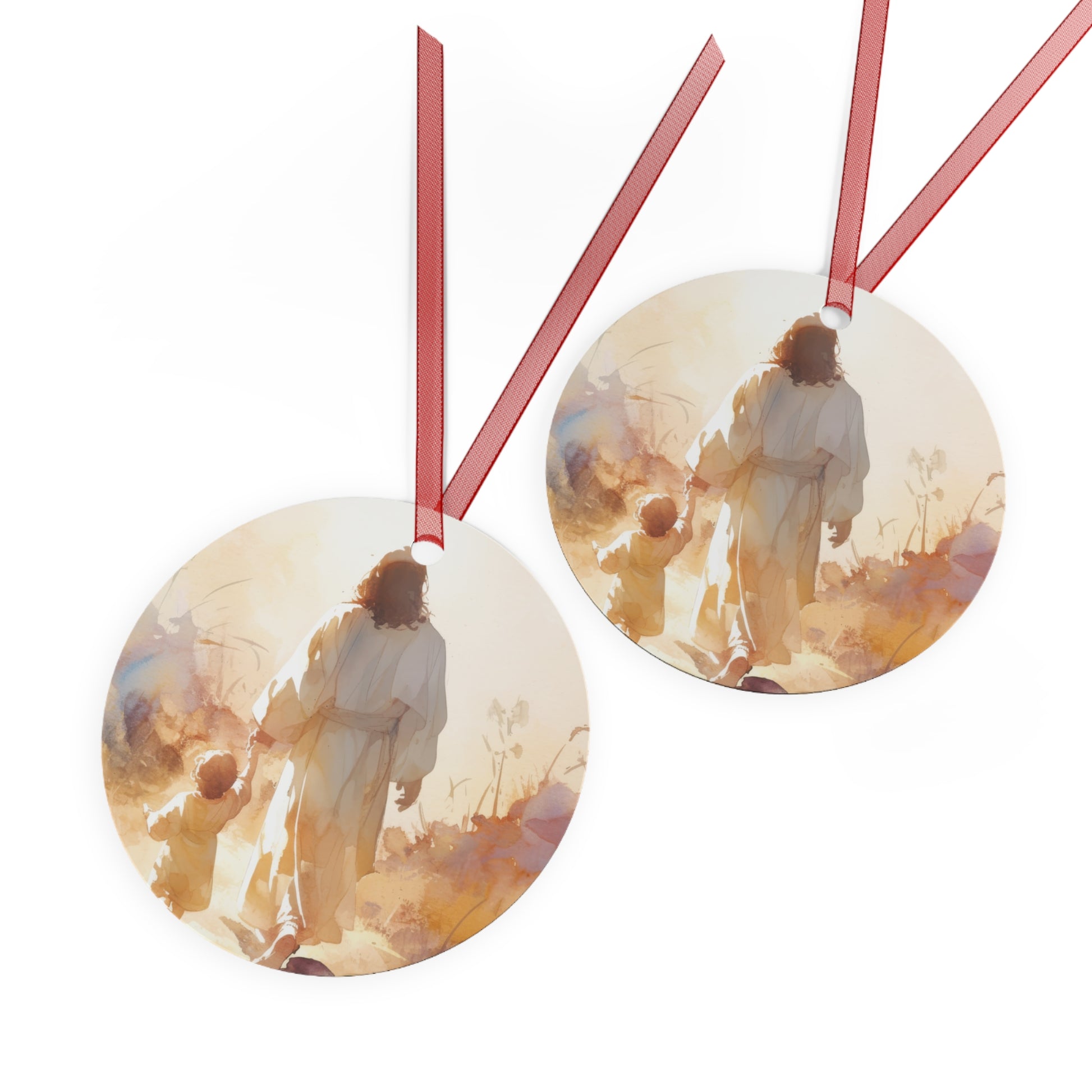 Jesus Guiding a Child in Faith Metal Ornament - Religious Holiday Christmas Ornament and Keepsake - Catholic Keepsake