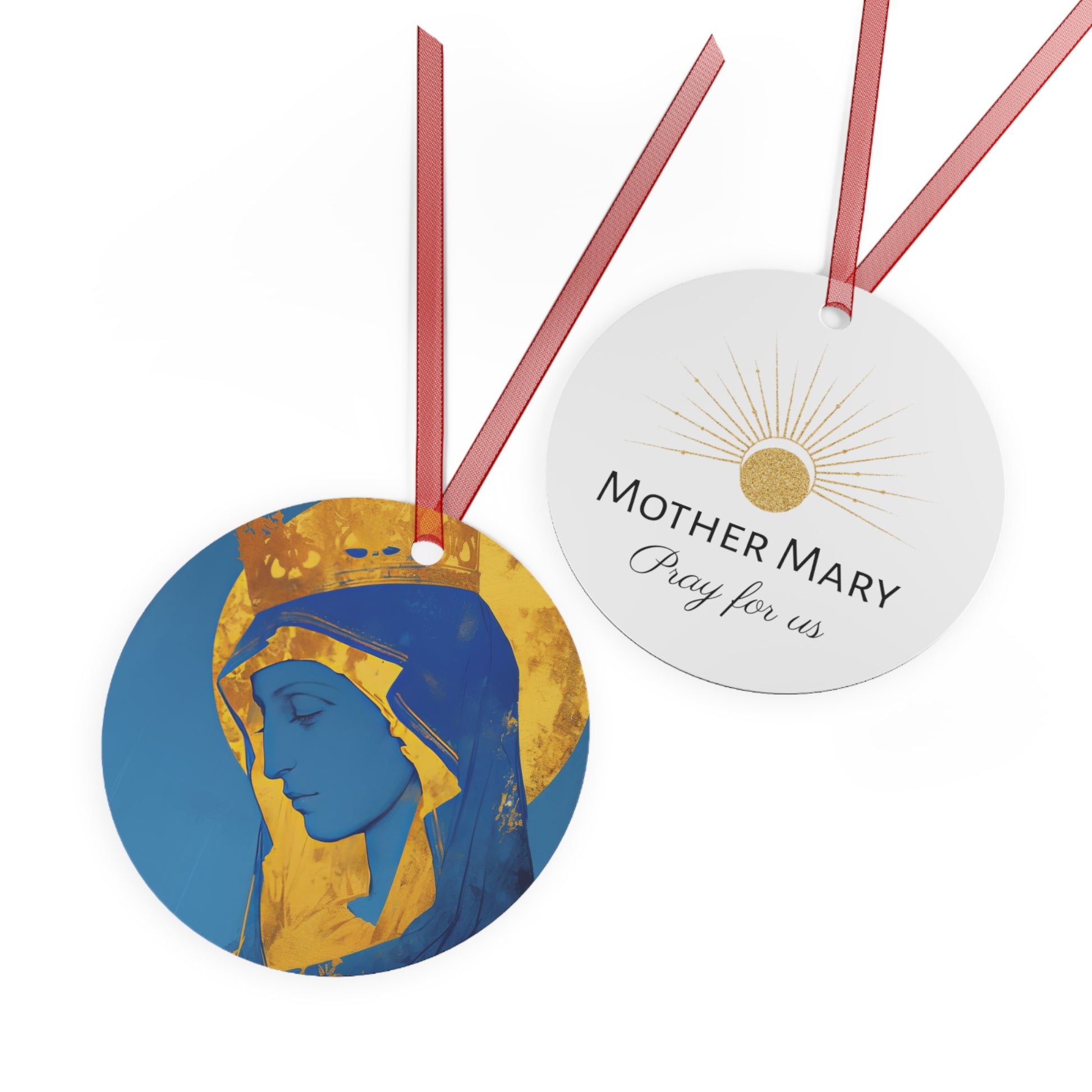 Each ornament is meticulously crafted, capturing the essence and distinctive attributes of these beloved figures. With a harmonious blend of colors and details, this round metal ornament becomes a captivating display of devotion and a source of inspiration for your faith journey.