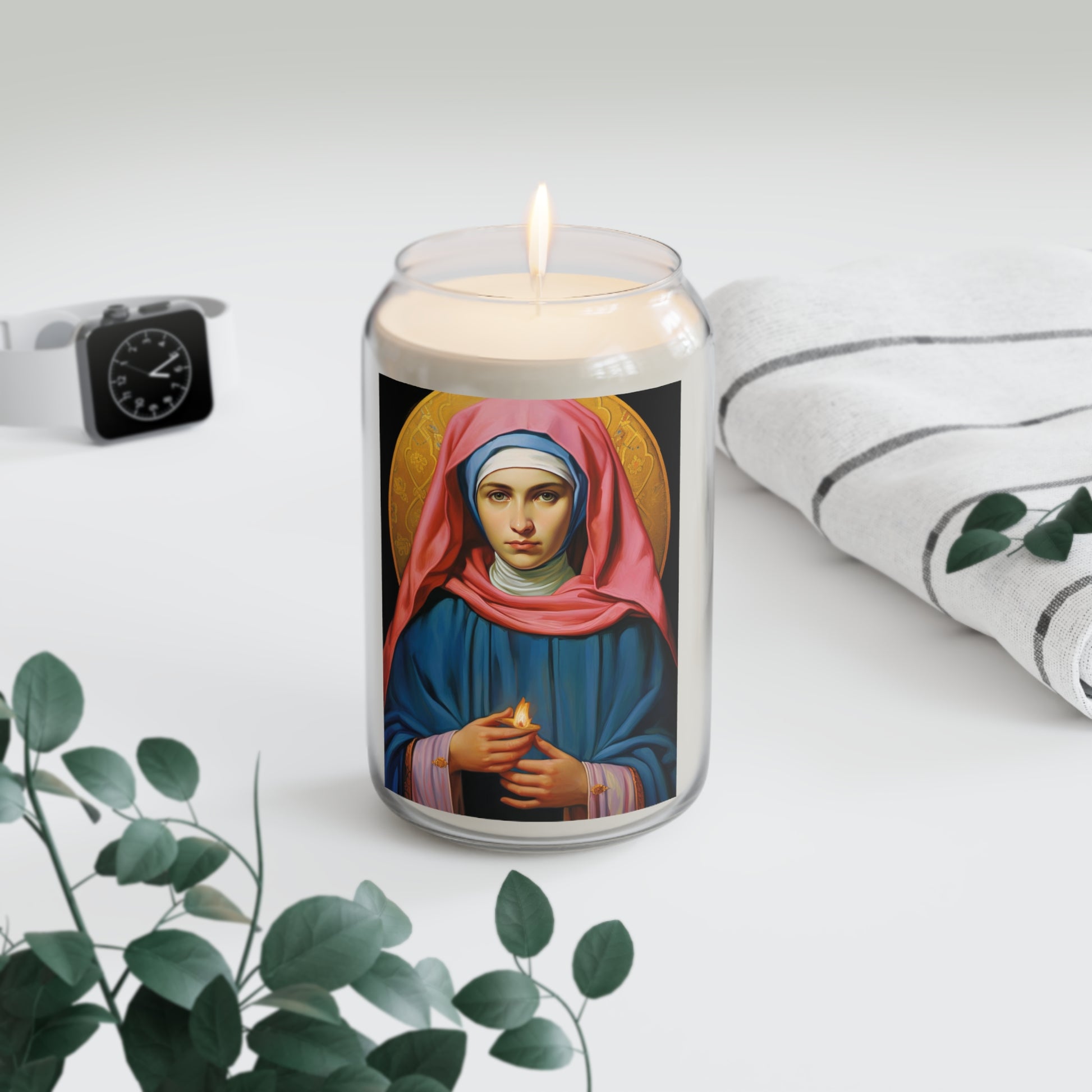 Welcome to Sanctified Souls Shop, where divine illumination meets aromatic tranquility. Experience the spiritual essence with this scented prayer candles featuring saints or Divine figures who inspire and guide us on our sacred journey. Each candle in our collection is thoughtfully designed. Made with a 100% natural soy wax blend, these scented candles feature a 100% cotton wick and deliver 70-80 hours of blissful relaxation. For best results, burn candle 3 to 4 hours of each lighting and trim wick to 1/4". Discontinue use with 1/2" of wax remaining.