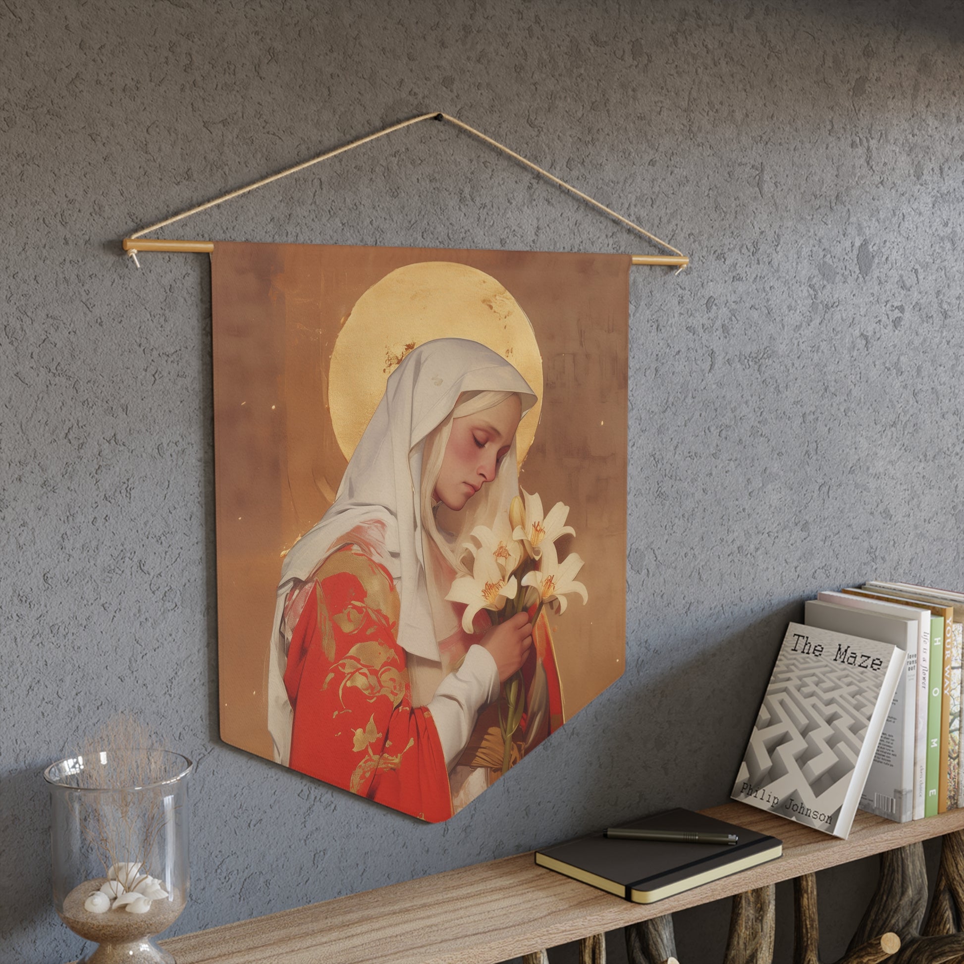 Immerse your space in the divine presence with our exquisite Wall Hanging/Pennant/Banner, adorned with the image of one of my saints or divine figure portraits. Each detail of this sacred artwork resonates with spiritual significance, offering a profound connection to the eternal wisdom and grace embodied by the chosen saint. This pennant comes with a wooden dowel for easy hanging.