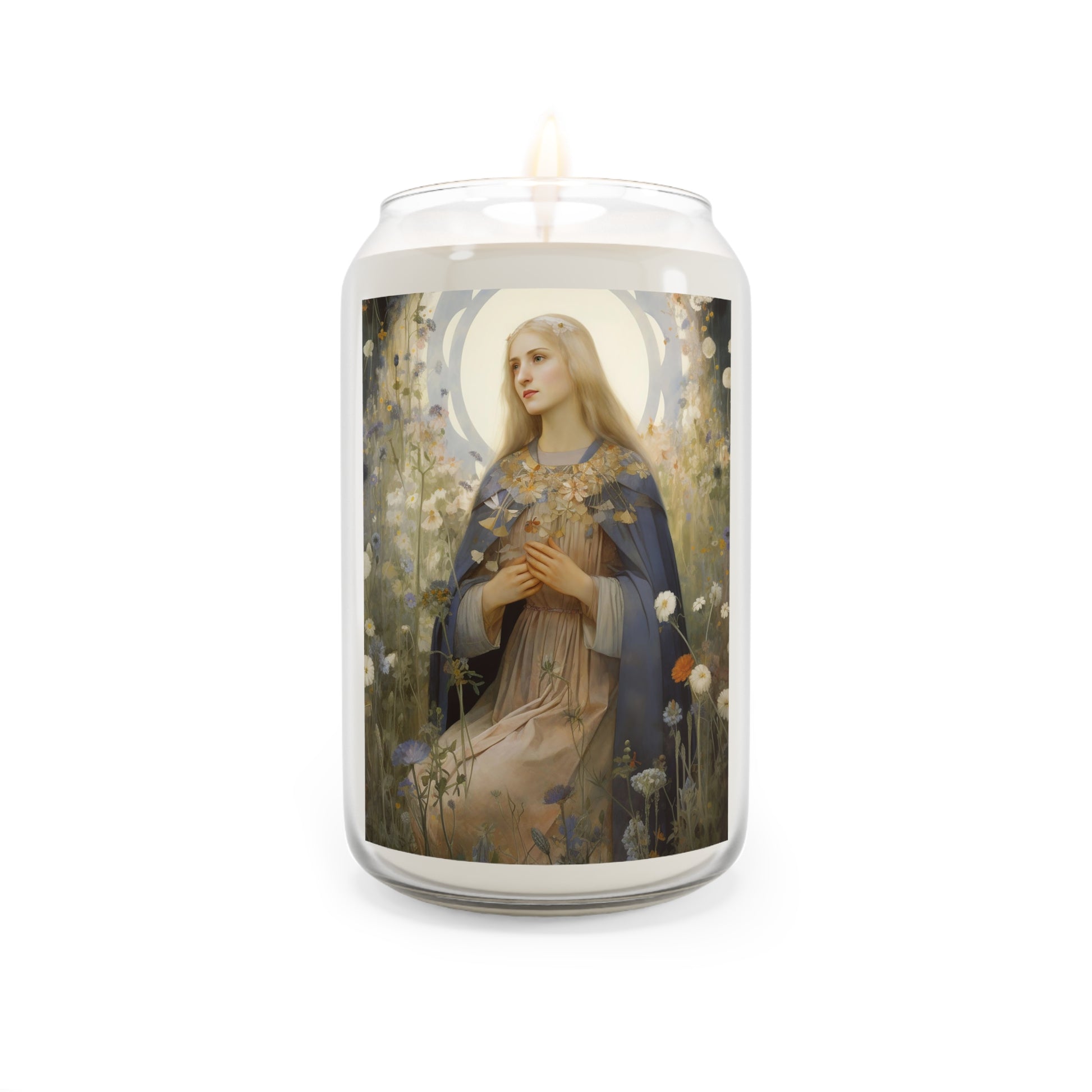 Welcome to Sanctified Souls Shop, where divine illumination meets aromatic tranquility. Experience the spiritual essence with this scented prayer candles featuring saints or Divine figures who inspire and guide us on our sacred journey. Each candle in our collection is thoughtfully designed. Made with a 100% natural soy wax blend, these scented candles feature a 100% cotton wick and deliver 70-80 hours of blissful relaxation. For best results, burn candle 3 to 4 hours of each lighting and trim wick to 1/4". Discontinue use with 1/2" of wax remaining.