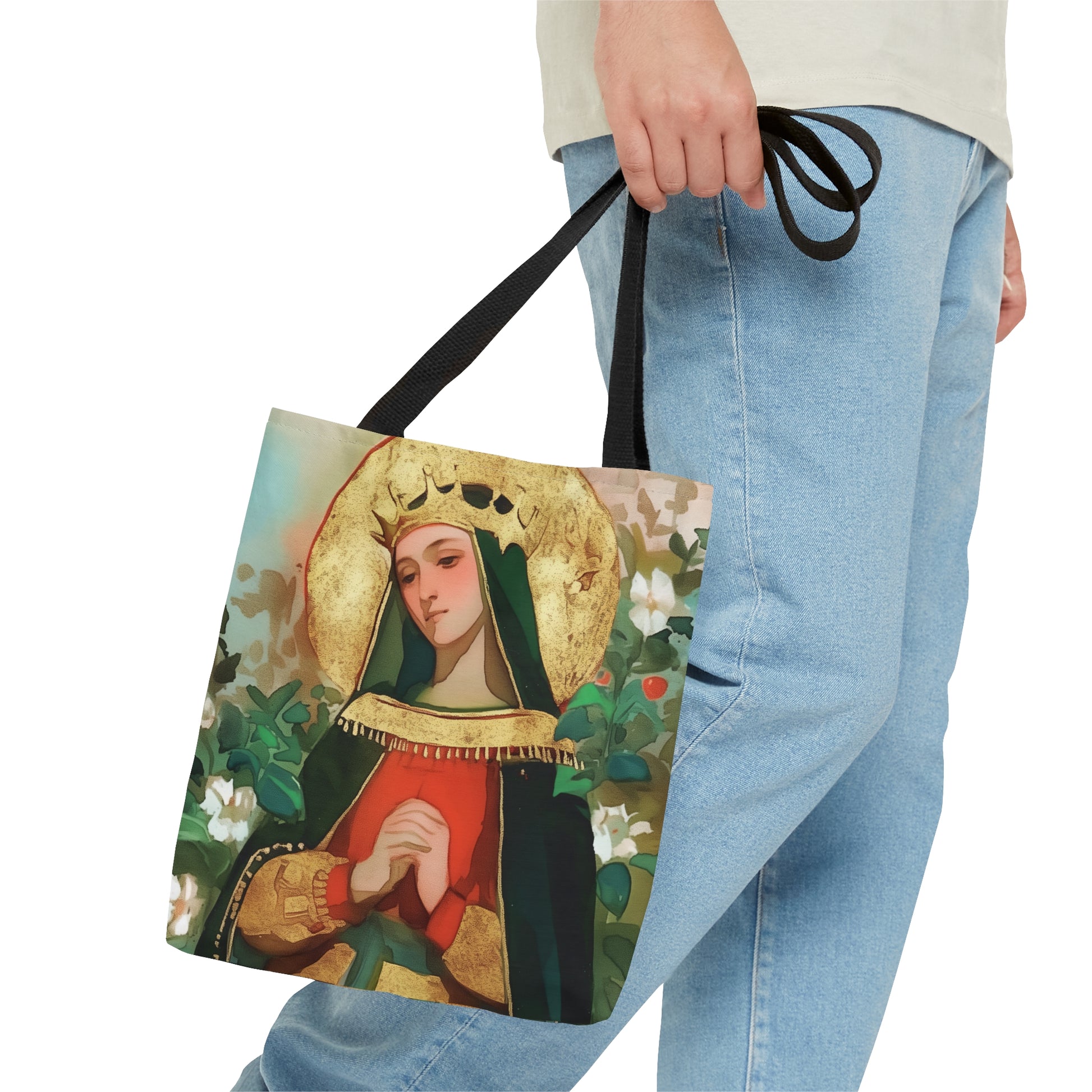 Welcome to Sanctified Souls Shop, where faith and art come together to create inspiring tote bags. Embrace the transformative presence of our extraordinary tote bag inspired by a Saint or Divine Figure. This bag is double sided All-Over-Print and features the same illustration on both sides. This practical, high-quality Tote Bag is available in three sizes.