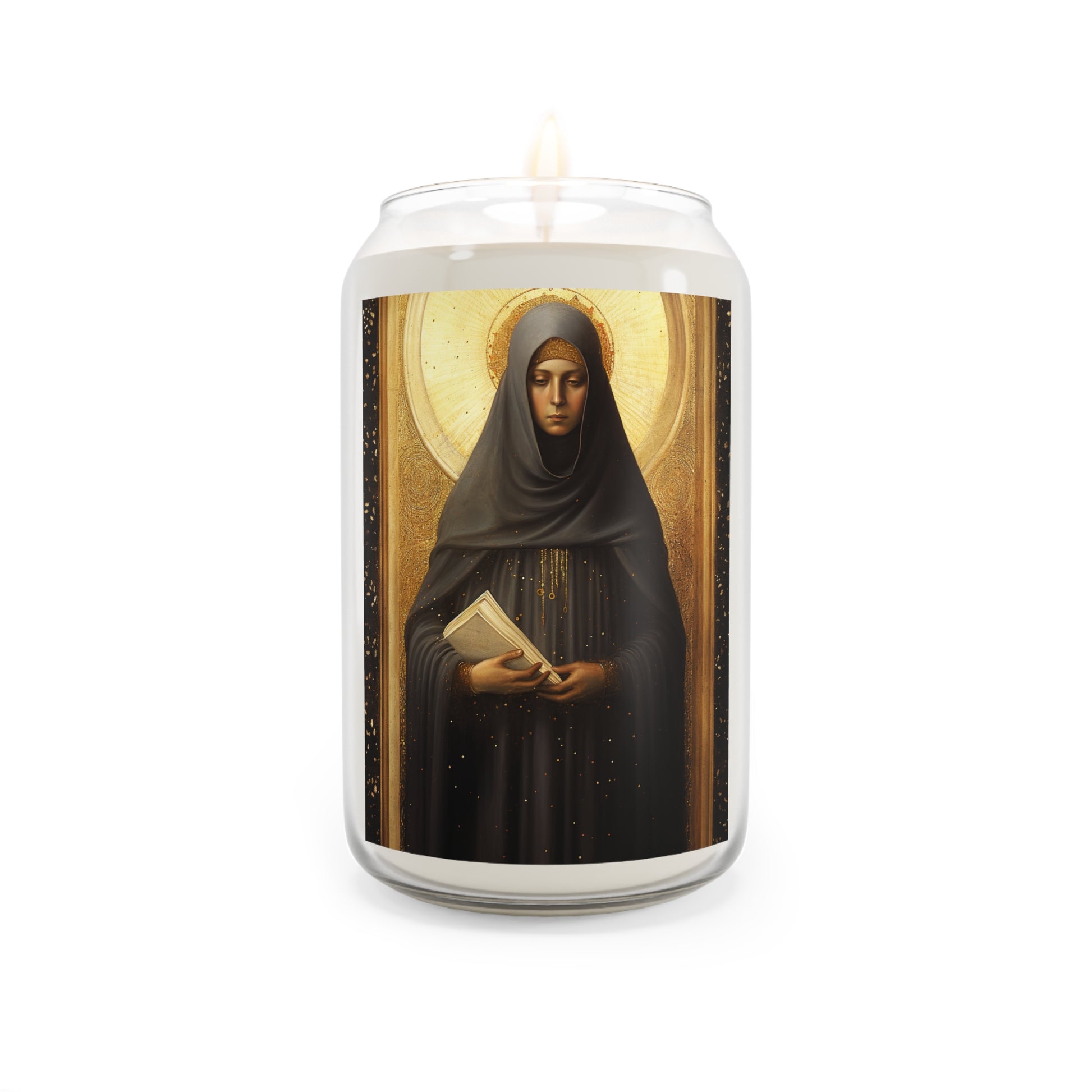 Welcome to Sanctified Souls Shop, where divine illumination meets aromatic tranquility. Experience the spiritual essence with this scented prayer candles featuring saints or Divine figures who inspire and guide us on our sacred journey. Each candle in our collection is thoughtfully designed. Made with a 100% natural soy wax blend, these scented candles feature a 100% cotton wick and deliver 70-80 hours of blissful relaxation. For best results, burn candle 3 to 4 hours of each lighting and trim wick to 1/4". Discontinue use with 1/2" of wax remaining.