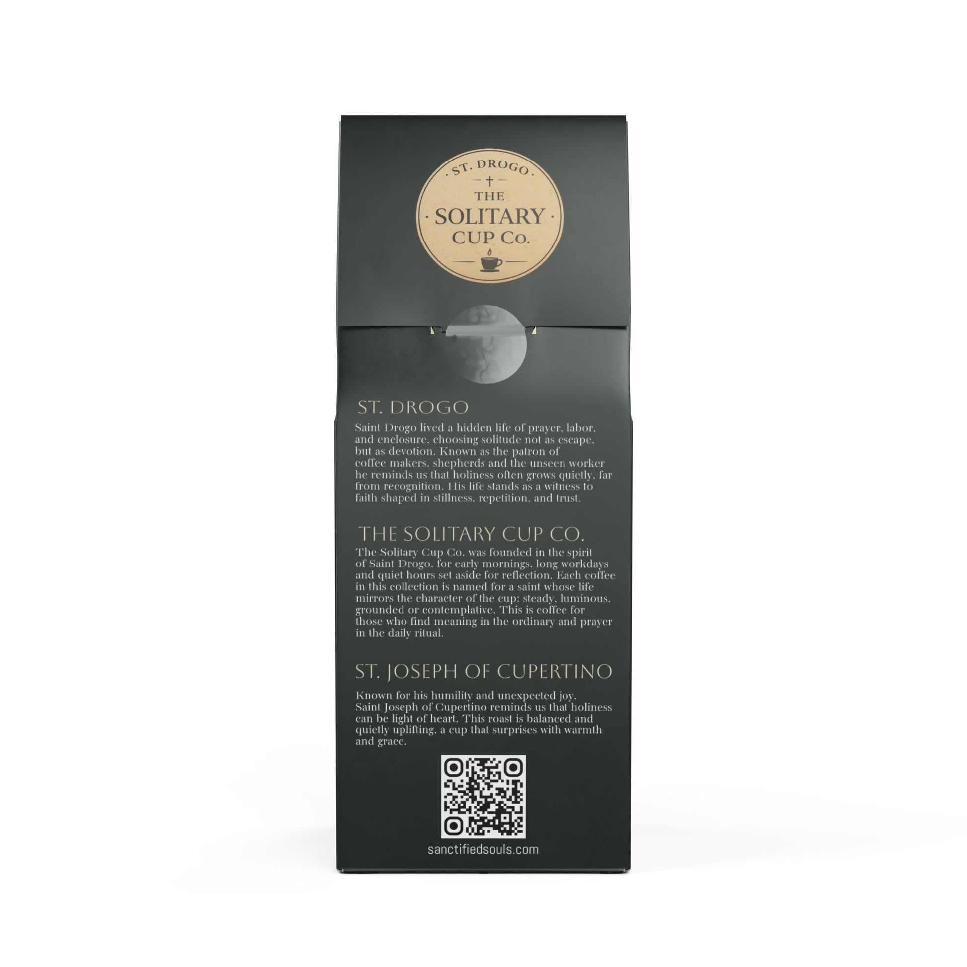 St. Drogo - The Solitary Cup Co. is presented by Sanctified Souls, a studio devoted to sacred art, devotional living, and faith-rooted craftsmanship. Each bag includes a QR code linking back to sanctifiedsouls.com, where customers can learn more about the saints, the story behind the collection, and the quiet life that inspired it.