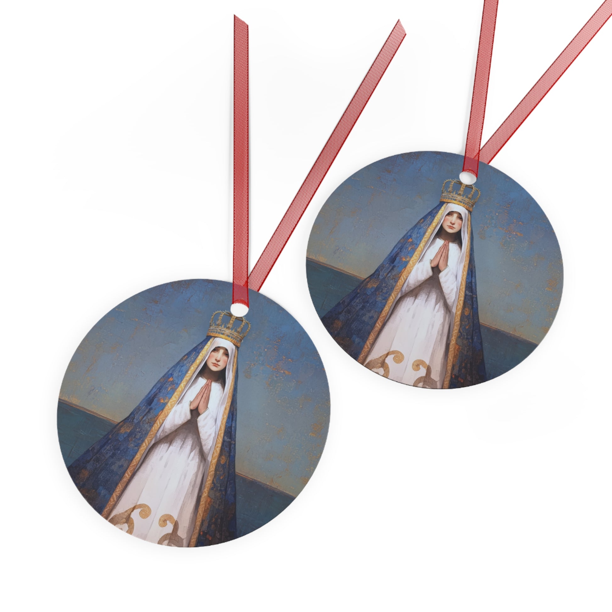 Each ornament is meticulously crafted, capturing the essence and distinctive attributes of these beloved figures. With a harmonious blend of colors and details, this round metal ornament becomes a captivating display of devotion and a source of inspiration for your faith journey.